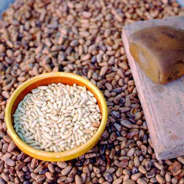 Piñón Ibérico Pelado Natural. Sabor a Resina que nos traslada a lo más profundo del monte natural y virgen onubense. Y no en vano por sus 3 años de maduración en pinos que reciben el paso de la resina. Gracias a la apertura de las Piñas con el sol de la Península Ibérica, conservan todas las propiedades sin perder ningún sabor resinoso y su color apetecible.